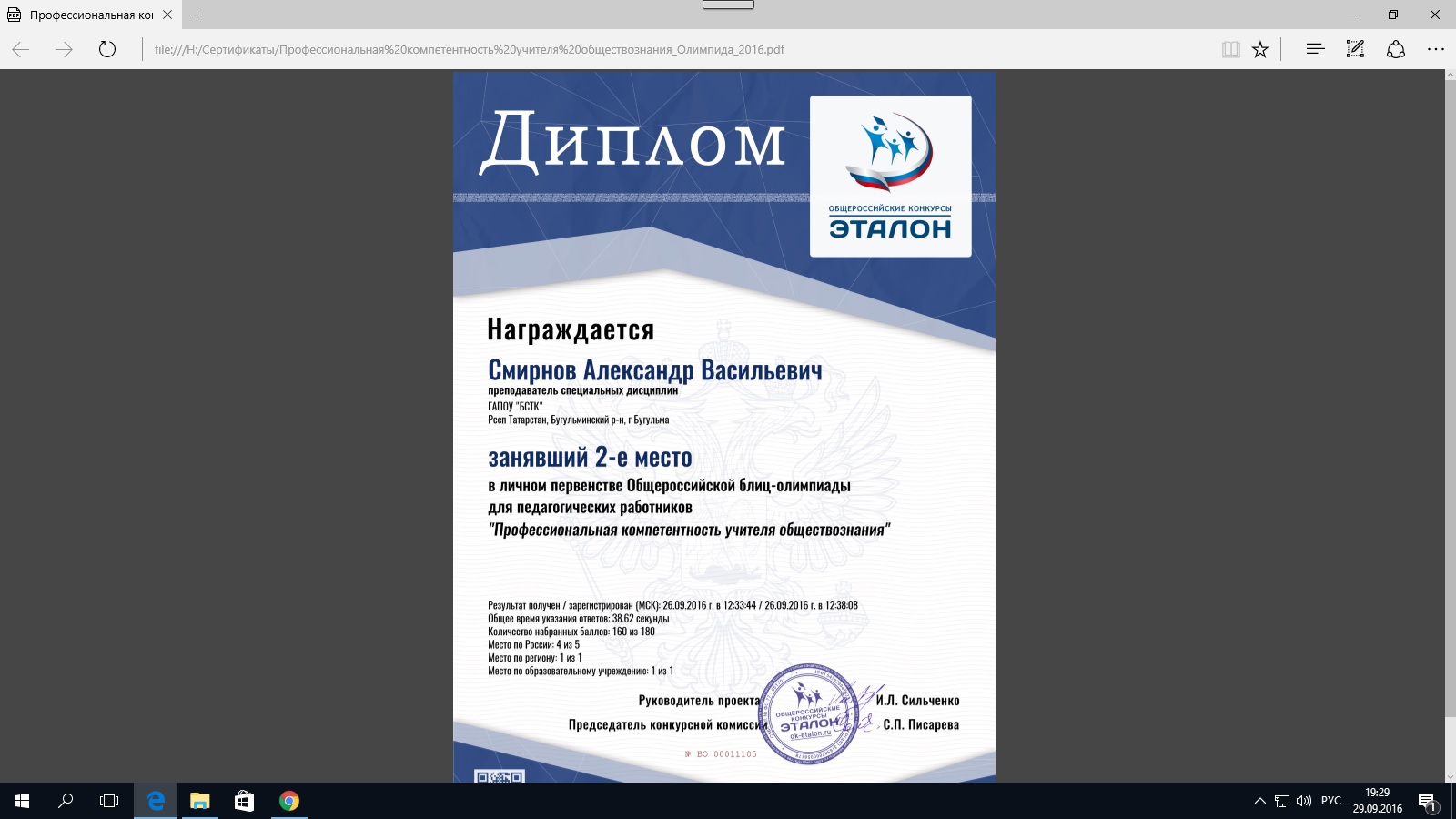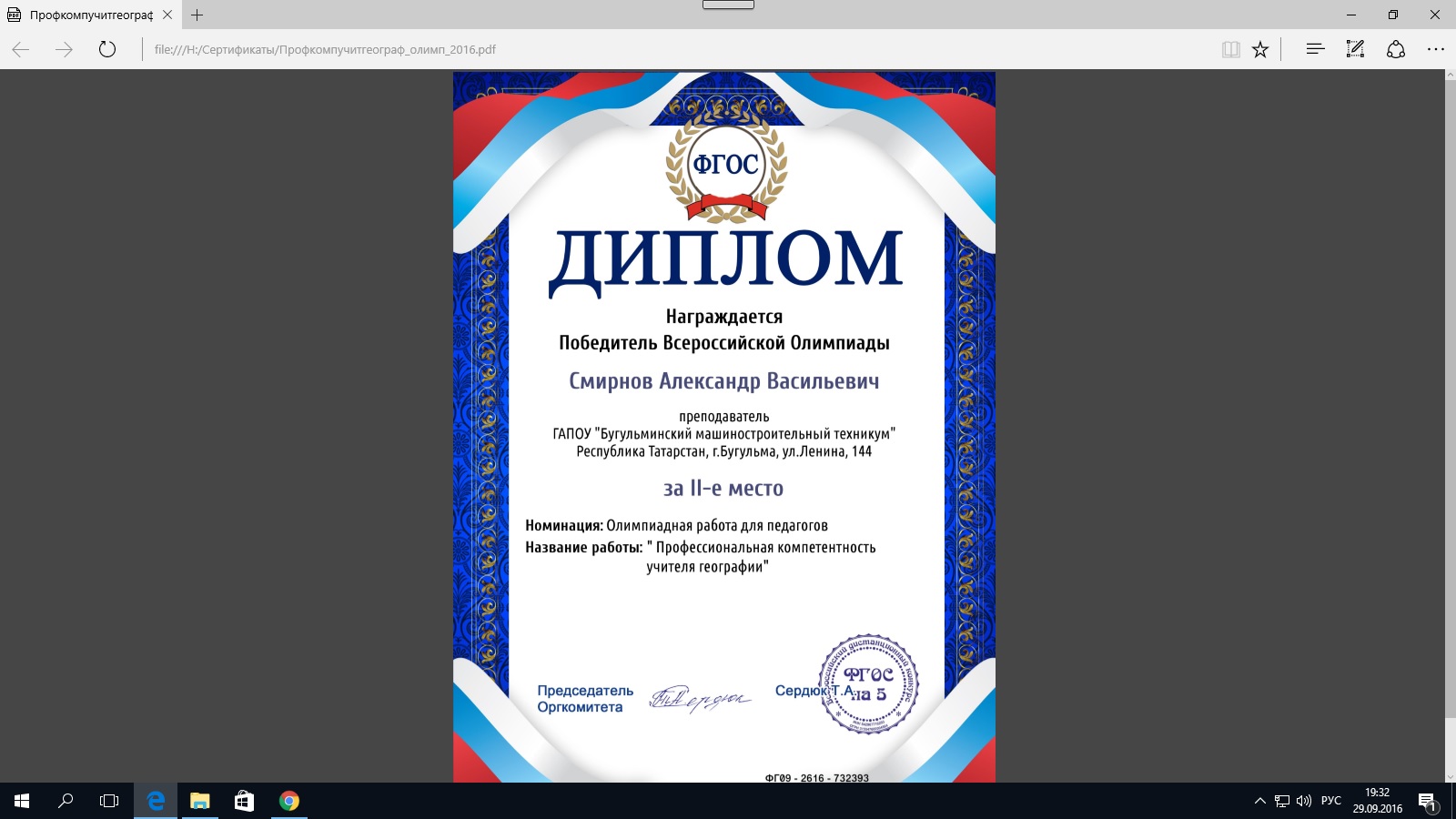 1. Всероссийская олимпиада "Профессиональная компетентность учителя географии" (2-е место)