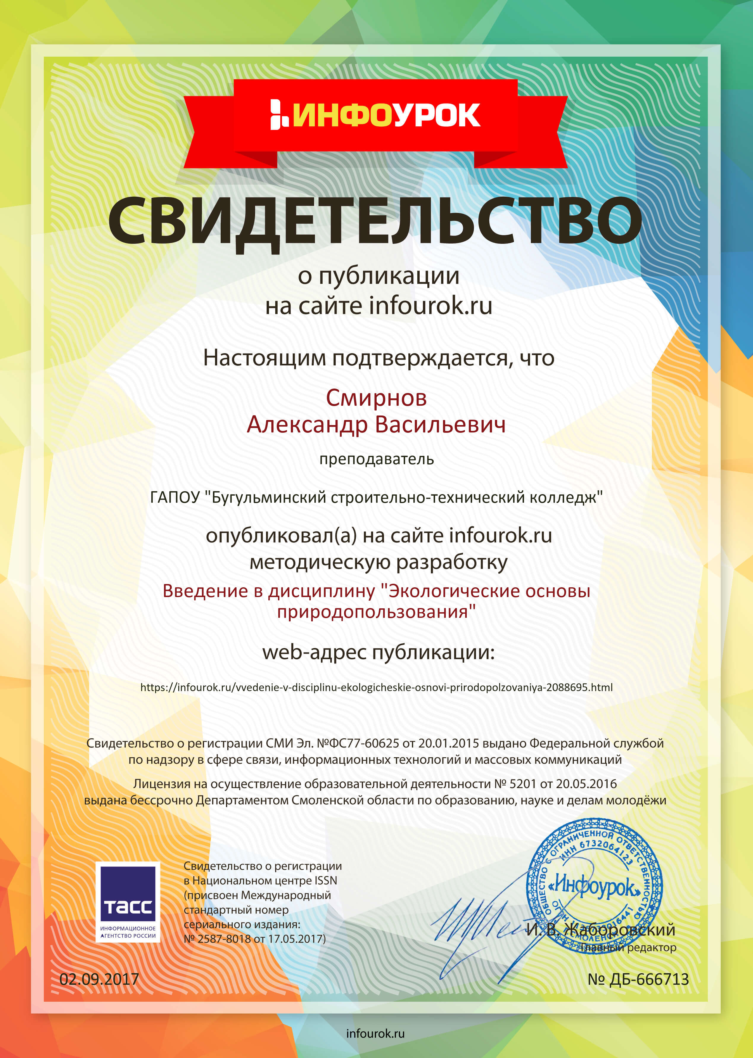 7. Методическая разработка «Презентация к занятию для студентов профессиональных образовательных учреждений «Природное и общественное в человеке» //Сайт «Infourok.ru». – Свидетельство № ДБ-681620.